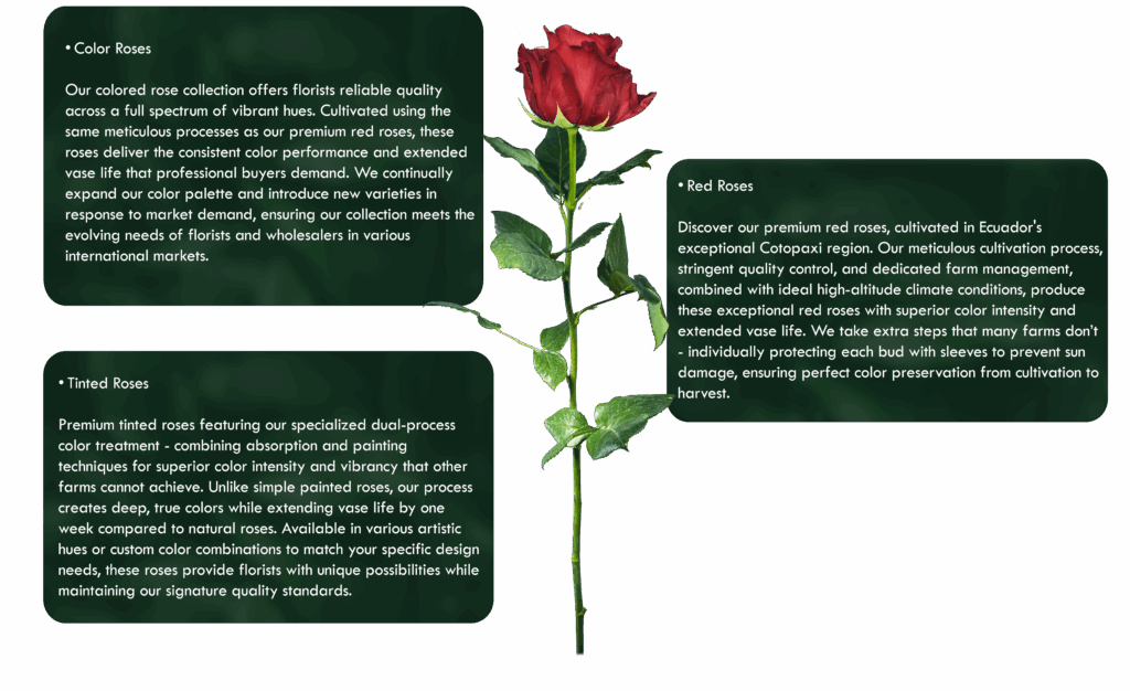 Our high-altitude cultivation and meticulous processing mean large heads, intense petal color, bright foliage, slow petal drop, and extended vase life—helping your designs stand out in every market, season after season.